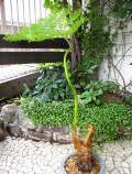 *ヘゴシダ* 柔らかな大きな葉とユニークな産毛に覆われた幹をもつヘゴ。 原生林にいるような気分を味わえる涼やかな姿の1本です。 乾燥を嫌うので春~秋は土の表面が乾いたら水をたっぷり。 葉や茎にも水をかけてやります。 夏の直射日光はNG。5℃以上なら室内で越冬できます。 ザラザラした質感の石の器に入れてお届けします。